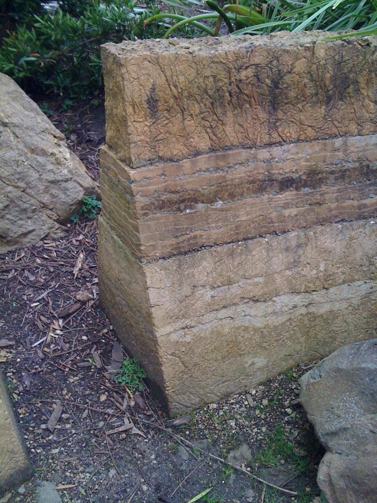 This is a concrete wall in the SF Botanical Garden made to look like ancient layers of stone by lining the inside of a form with tinfoil and pouring multiple layers of concrete, each with a different texture and color.