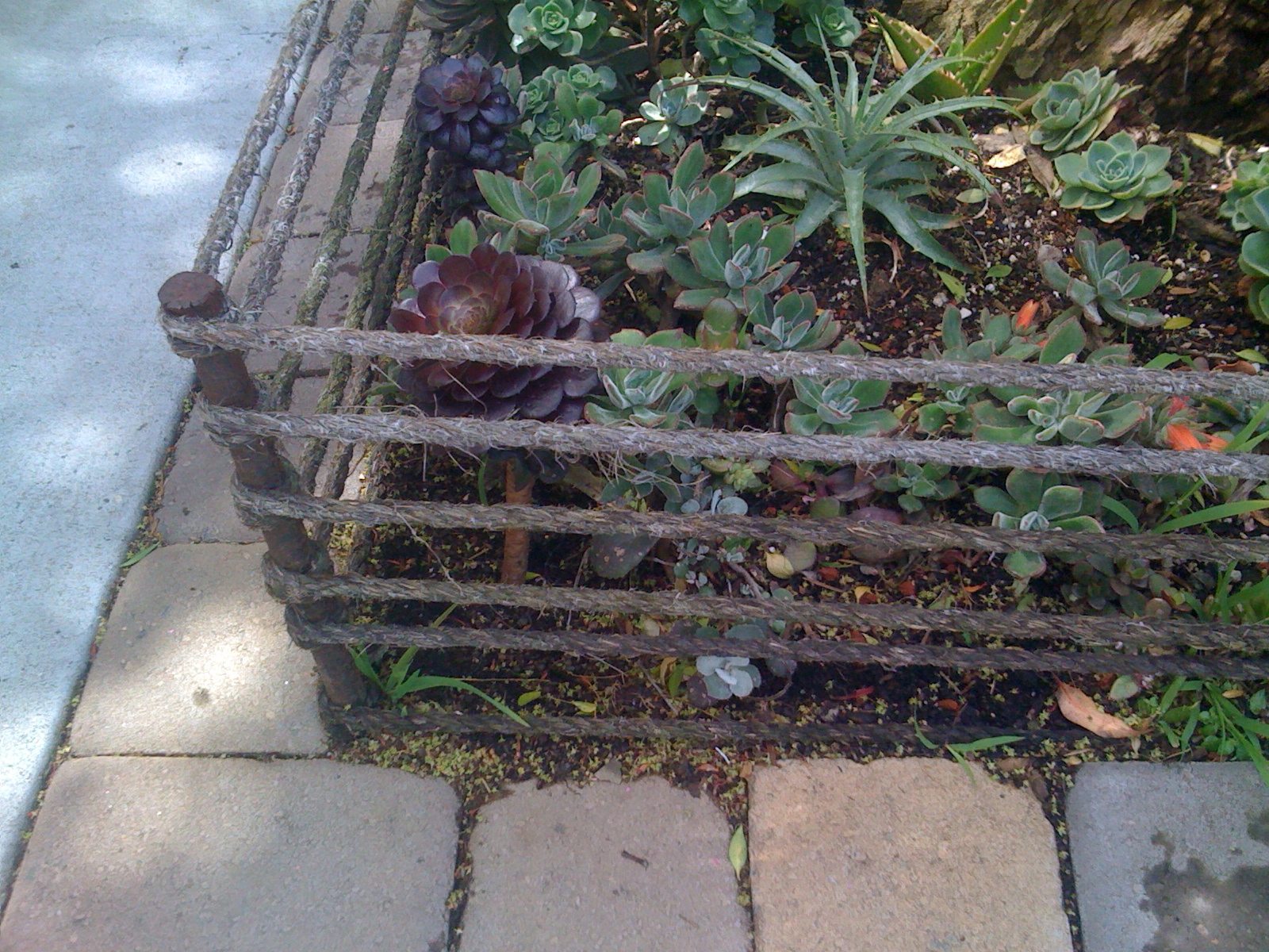 Planting in a city sidewalk is a noble endeavor but almost always a gamble. Between the car doors, peeing dogs, and rambling drunks, these plants endure a constantly threatened existence. Protective sidewalk barriers are often flimsy and get beat up quickly. But build one out of half-inch thick rope and four pieces of rebar, and you have a sturdy, inexpensive, and easy solution. Even better, the plants remain in full view and the design complements the small square landscape.