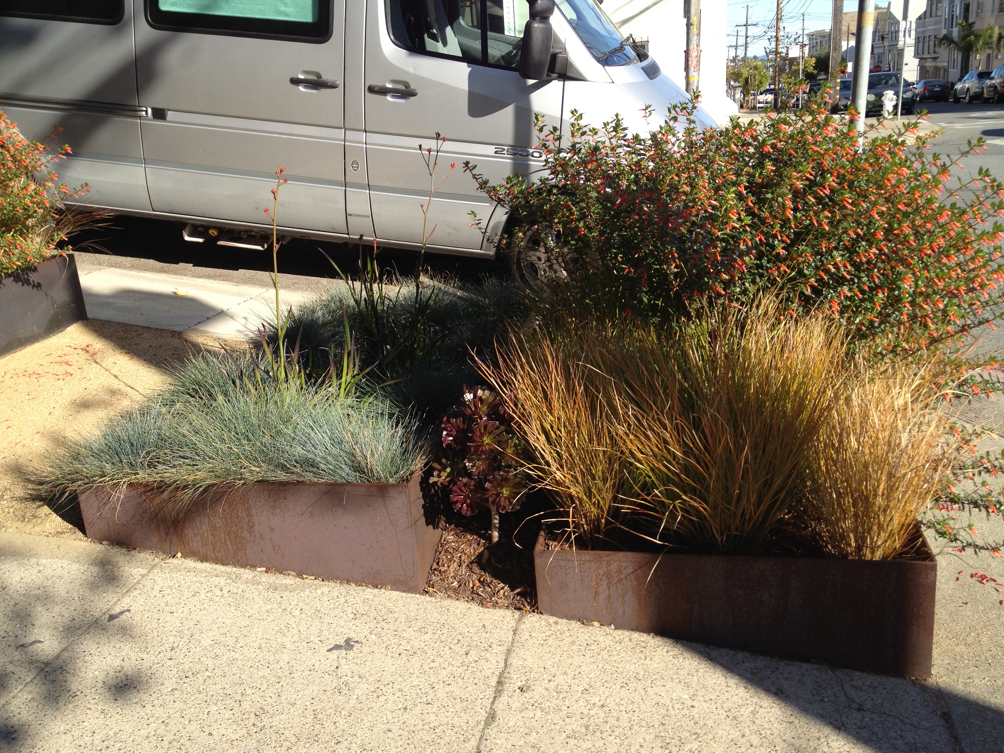 The ancient gardening art of terracing has been used all over the world for taming hillsides while simultaneously respecting their, shall we say, “hill-ness”. A steep asphalt street in Noe Valley is no exception. One of the best sidewalk gardens in San Francisco, this one uses modern-looking metal boxes, which are both durable and develop an attractive rust patina. The grey-green and golden grasses, wine-colored aeoniums, and bright red kangaroo paw offer complementary hues as well as diverse textures. And an added benefit? The small gardens are something to stop and check out while huffing and puffing one’s way up the hill!