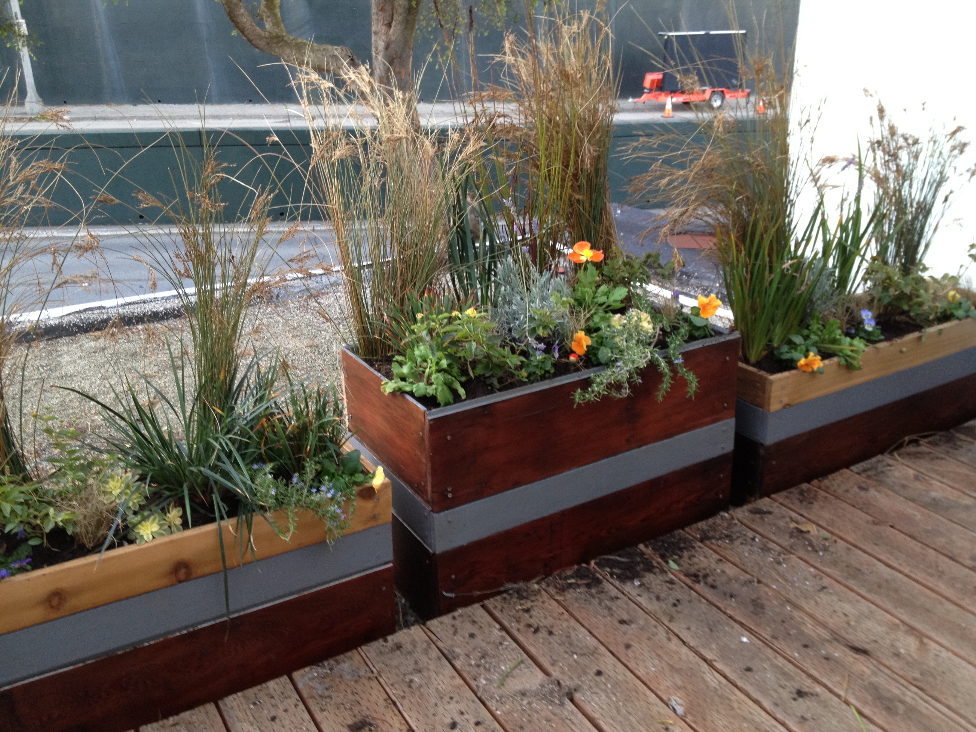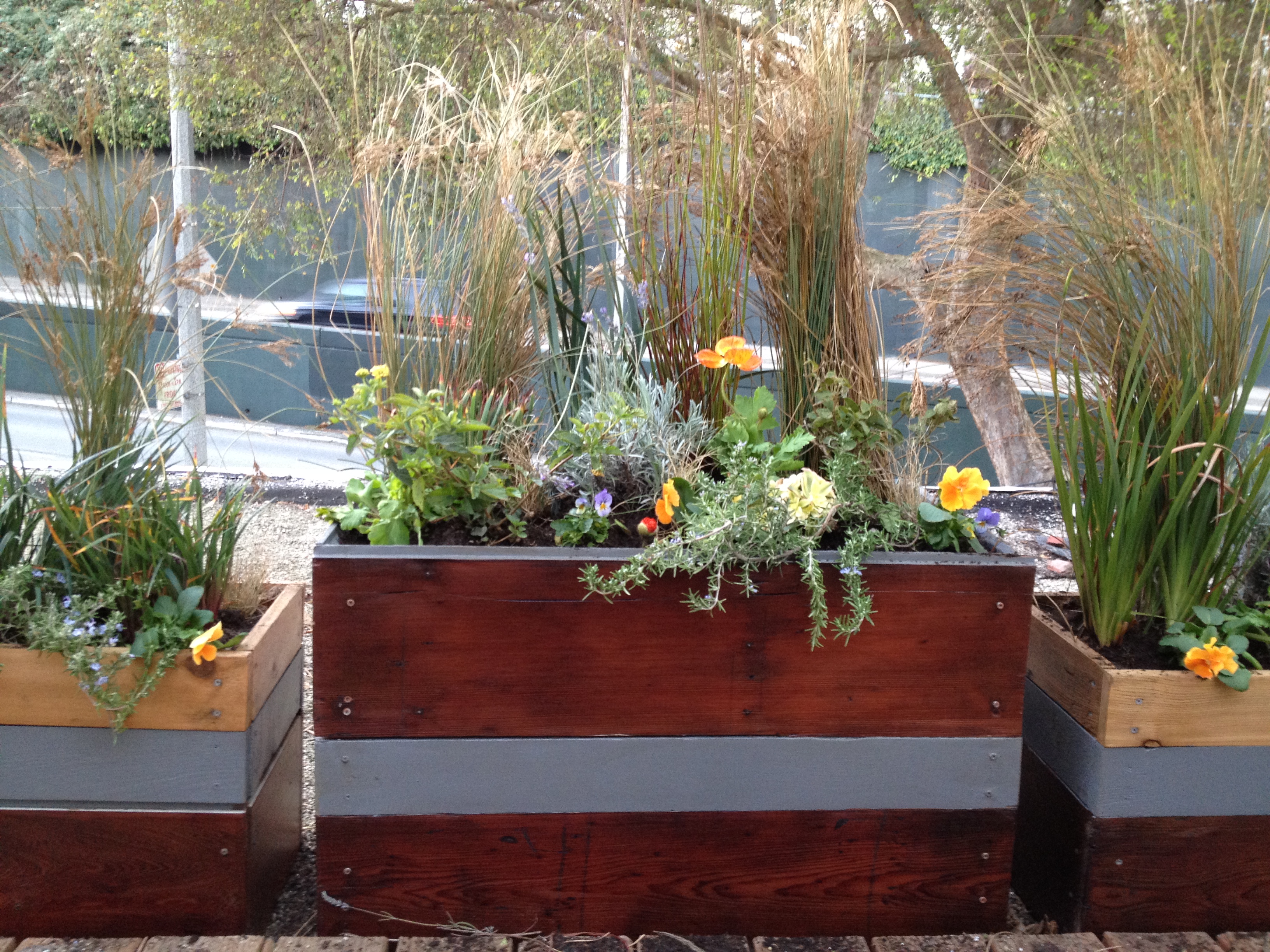 Holding the entire Bolinas-themed garden together are planter boxes made by Small Spot Gardens from reclaimed redwood and cedar from Building Resources, a non-profit organization located in Bayview that’s dedicated to reusing materials in the built environment.