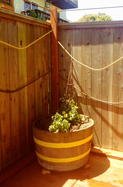 This wine barrel embodies simplicity and purpose: painting the metal bands yellow to accent the yellow flowers of the thunbergia vine took about fifteen minutes yet has a significant impact on the design. It’ll be great when the vine covers the back wall …