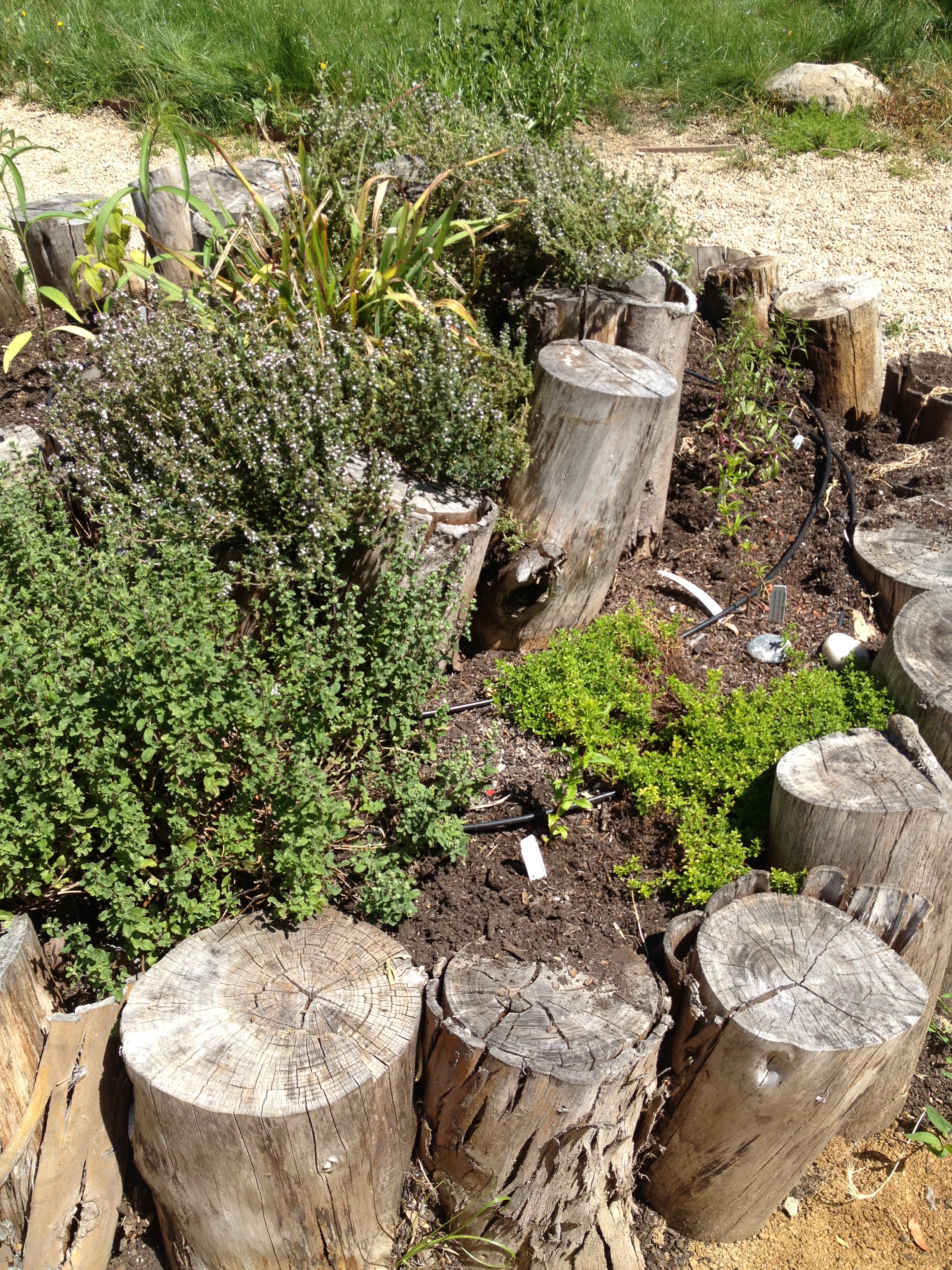 At Merritt College’s permaculture garden in Oakland, an herb spiral is shaped by short, uneven pillars. The wooden outline can also double as seats while the gardeners pick their thyme and oregano!