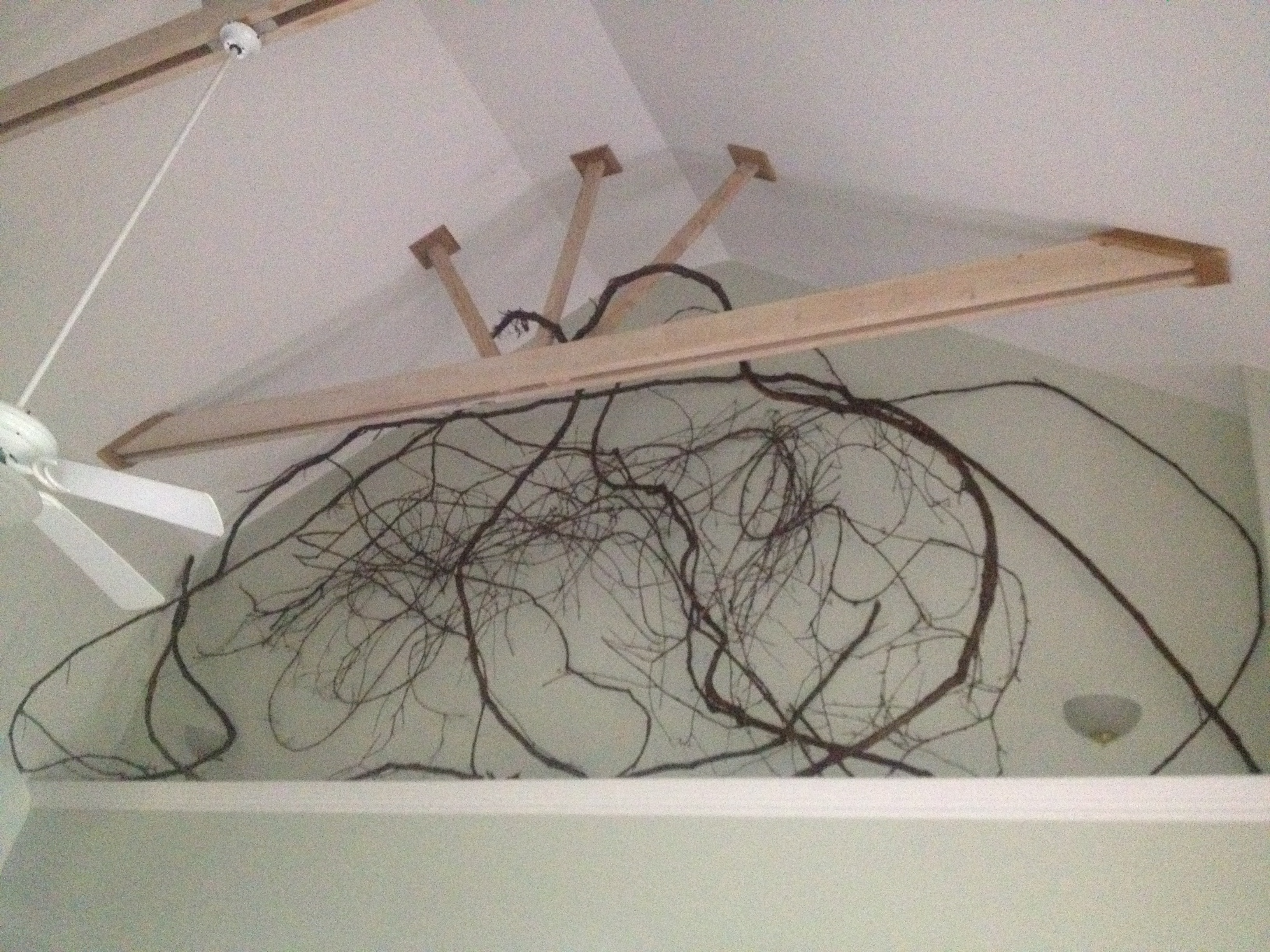 This is a wild grape vine that Elisa’s parents placed in a blank spot in their home. The twisty nature of this plant in inherently sculptural; it’s not hard to imagine using a dead, woody vine as a trellis for a more delicate plant, such as peas in a veggie garden.