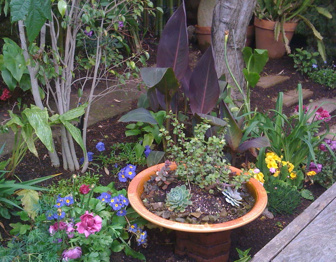 This shady backyard is used by a number of long-term tenants in Noe Valley. They weren’t allowed to change the structure of their backyard but they still wanted something more dynamic and beautiful (a common issue for renters). The larger plants and several cacti were off-limits, but smaller plants could be moved around to give the garden a better sense of pattern. Adding color and fixing up the vegetable bed — both quick ways to revitalize most gardens — were high priorities. We were able to build more of a color scheme by buying just a few new plants and paying attention to where they would have the most impact. The existing irrigation system was redesigned and re-used in the veggie garden, saving both costs and waste.