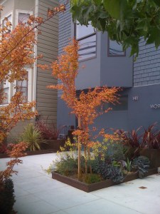 In a city brimming with charming buildings and, uh, unique people, it can be easy to go unnoticed in San Francisco. These rectangular planters, though, do an admirable job of being an eye-catching and dramatic addition to the sidewalk. The orange, crinkly leaves and bark of the Japanese maple leap like flames, offering an intense contrast with the dark modernity of the house in the background. Some sort of brassica in the middle is a tad overgrown, but the color combo of the yellow flowers and the silvery blue foliage more than makes up for any legginess – in one plant you’ve got the gray that ties the garden to the house and great little sparks of light to attract attention.