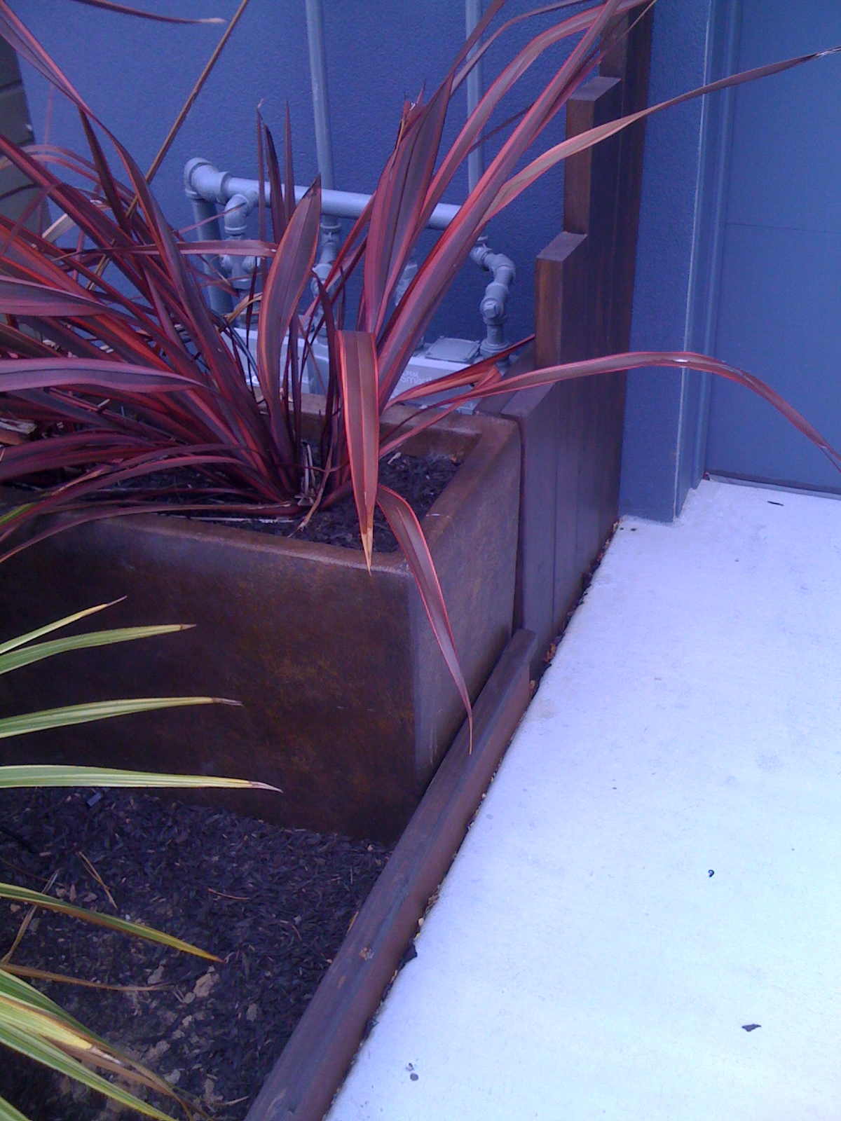 Need a creative way to get rid of some pipes? Hide them behind a crimson clump of phormium and a rectangular container. Tie it all together with a simple wooden wall of the same color and from a distance it looks like a complicated custom built piece. These small plots are a good reminder that the right mix of colors and growth forms can be both aesthetically luscious and functional, too.