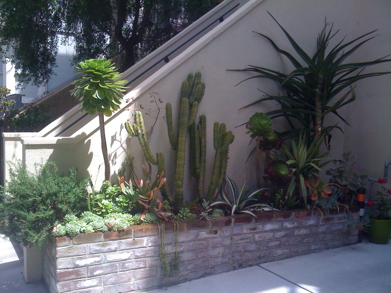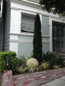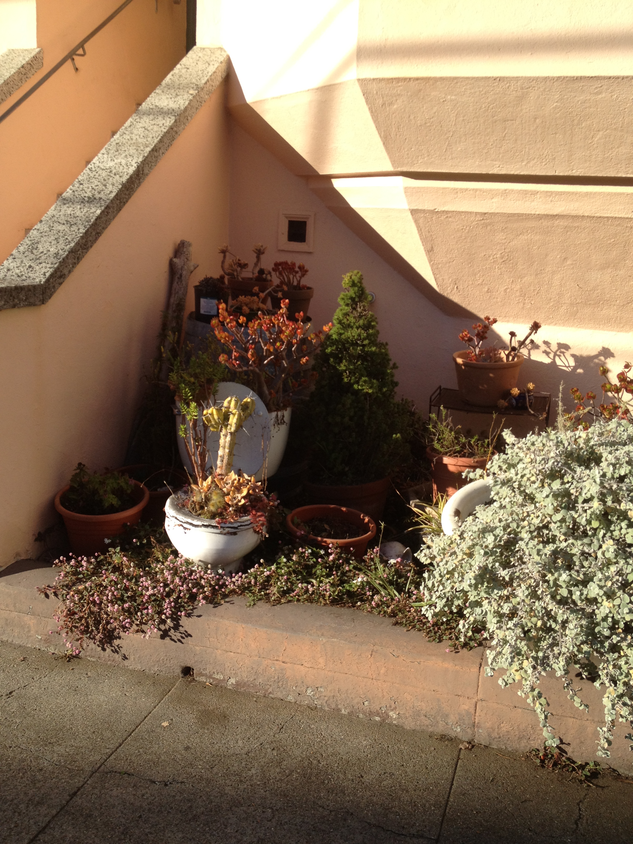 Re-purposing decommissioned porcelain from bathrooms for use as garden planters is undoubtedly not everyone’s style. Sometimes the attempts at funkiness and kitsch, once executed, can be a little too, well, trashy and haphazard. However, this aesthetic can serve many practical purposes. In a city where theft is a constant issue (sometimes even ceramic gnomes can’t protect a junkyard garden!), toilet- and bathtub-planters present a hefty challenge to potential potted plant thieves. And of course, diverting housing materials from a slow death in a landfill is always a huge bonus. In terms of design, this Inner Richmond garden makes a small rectangle look thoughtfully put together, employing different heights and a complementary scheme of colors and textures to create a coordinated flow, almost like a still life painting. And if you plant a cactus in a old toilet, rest assured no passer-bys will attempt to use it!