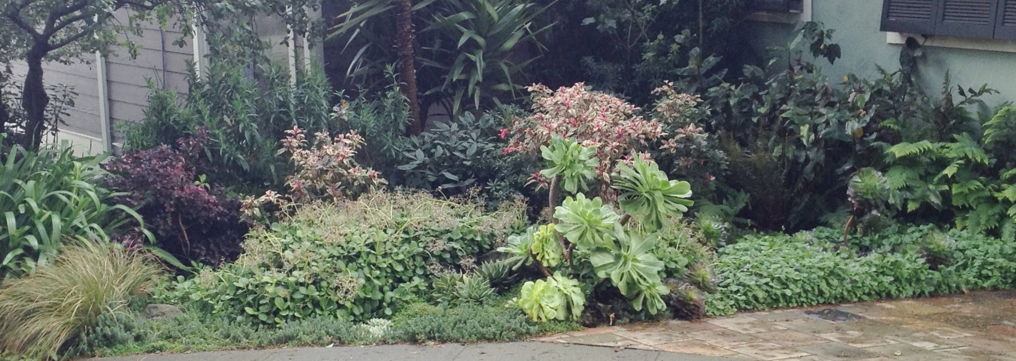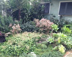 This garden is on the north side of a house high up in Twin Peaks. It’s a fairly sizeable front yard for the area and instead of lawn or hardscape they filled it with a great selection of pink and green shade-tolerant plants like pieris, ferns, loropetalum, sedums and aeonium.