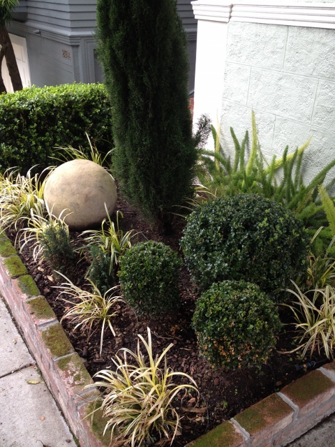 A small space held together by moss-covered bricks, and filled with an array of green plants – sculpted tufts of Buxus, asparagus fern, Italian cypress, liriope. Very classic, sure, but this relatively simple design is catapulted into the realm of “way more interesting” by the simple addition of a ceramic ball (no, it’s not a giant puffball mushroom). This unadorned sphere adds a modern, sculptural dimension to a timeless garden palette.