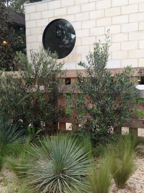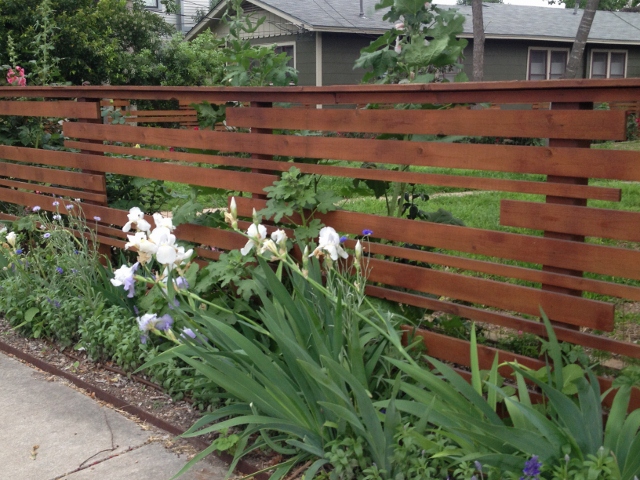 Leave it to a garden designer to go to one of the world’s premier music and media conferences and return home with a ton of pictures of…..fences. This horizontal wooden fence is not only stylish in its simplicity and departure from the more common vertical alignment, it is also a “smart” fence, with two of the sides having gaps between the slats but the side shared with the neighbors being solid and allowing for more privacy.