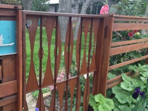 The metal gate provides continuity by using the same rust color as the wooden fence but plays with the vertical dimension rather than the horizontal.