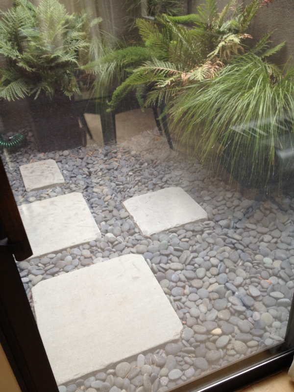 Ugly concrete floors and patios often, unfortunately, go with the territory of a garden. And though it’s usually feasible to break it up and haul it away (or, of course, re-use the urbanite in some creative way on-site), this extra labor isn’t always appealing. So consider this simple, attractive solution by simply by covering it with pebbles and adding a couple of pavers. This is an example from a tiny courtyard, but the same quick-fix could be applied in an outdoor space by adding edging to contain the pebbles.